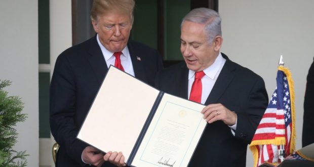 نددت عدة أطراف عربية ودولية بتوقيع الرئيس الأمريكي دونالد ترامب الاثنين إعلانا باعتراف بلاده بالسيادة الإسرائيلية على مرتفعات الجولان التي احتلتها إسرائيل من سوريا عام 1967 وضمتها عالم 1981. وفي حين رحب رئيس الوزراء الإسرائيلي بنيامين نتانياهو بالخطوة الأمريكية، أدانتها دمشق على لسان وزير خارجيتها.