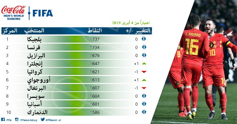 وظلت المراكز الثلاثة الأولى في التصنيف الدولي على حالها بتربع بلجيكا على عرش منتخبات العالم، تلتها فرنسا والبرازيل.